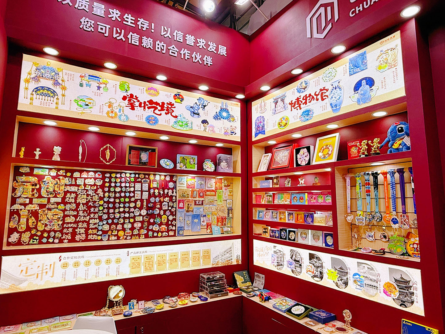 步入创新微越的展位,现场精心摆放着众多金属定制的产品,涵盖了奖牌、徽章、冰箱贴、立体摆件等多个品类。产品造型各异,种类与样式繁多,这些定制产品无一不体现出创新微越精湛的工艺与对品质的执着追求。从设计的精准还原,到工艺的细腻雕琢,每一个环节都处理得恰到好处,赢得了现场众多参观者的赞誉,展现了其强大的工厂实力。